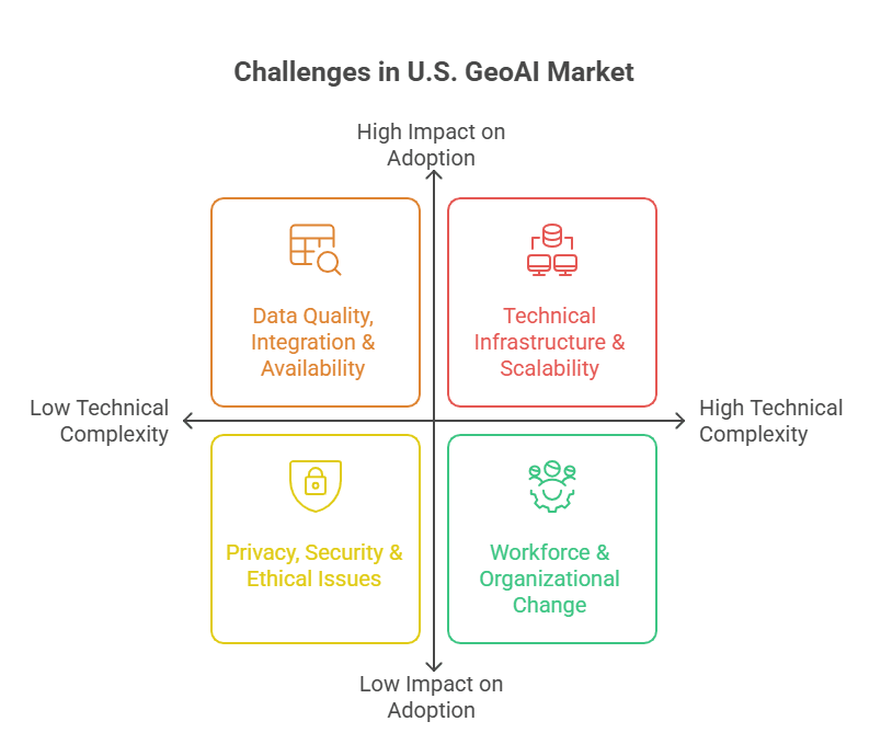Despite the promise, there are notable challenges that companies face when implementing GeoAI in the U.S.: